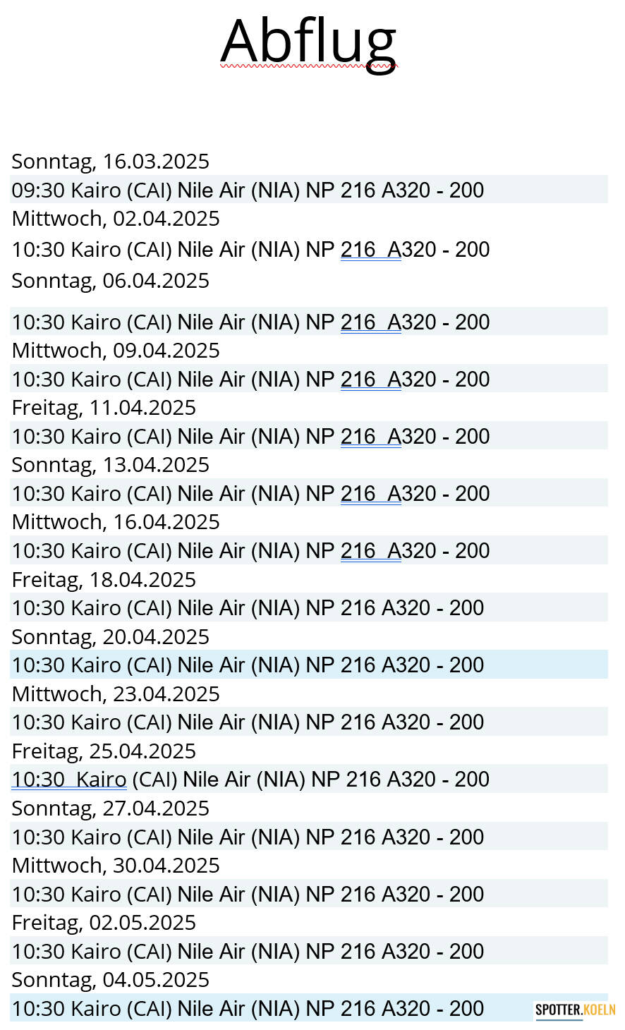 | Im Juli 2020 waren Flüge nach und von Köln Bonn geplant. (Unter Vorbehalt/Corona) Kairo/CAI-CGN-CAI 4 Flüge/Woche ab Donnerstag 16.07.2020 Tag Do-Sa-Mo-Di Ank. 05:40 - Abf. 06:35 NP211/NP212 Airbus A320-200 |