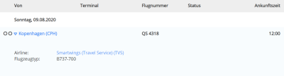 | Smartwings ist eine tschechische Billigfluggesellschaft mit Sitz in Prag und ein Tochterunternehmen der Travel Service. Smartwings wurde im Jahr 2004 als Tochtergesellschaft der tschechischen Travel Service gegründet. In den Jahren 2004/05 wurden zwei Maschinen des Typs Boeing 737-500 von der Deutschen Lufthansa geleast. Am 11. März 2012 wurde die letzte Boeing 737-500 der SmartWings durch eine Boeing 737-700 ersetzt. 2025: Eurowings setzt wieder Fluggerät von Smartwings ein, bis zum heutigen 11.04. sind 7 B737-800 in Köln angekommen:  2024 flog Smartwings mit B737 Max 8 nach Abu Dhabi (Ank. 14:30/ Abf. 21:25) 2023: Im Auftrag der Etihad Holidays plante Smartwings 2 mal pro Woche mit einer B737 Max 8 nonstop nach Abu Dhabi fliegen. Die ersten Flüge wurden ab 15.10.2023 jeweils Sonntag und Donnerstags durchgeführt.  Ab dem 01.05.2023 flog Smartwings mit B737-800 für Eurowings ab Köln Bonn. 12.07.2022: Flüge für ISRAIR (6H275/6H276) wurden 1x Woche von und nach Köln im Charter durchgeführt, Erstflug mit TVS B737 OK-TSO 2021: Smartwings flog ab 08.Oktober Vollcharterflüge nach Fuerteventura 1x wöchentlich: CGN-FUE-CGN Fr 19:05 QS3530  B737-800 Im August 2020 wurden 2 Flüge für den FC Copenhagen (Europa League) von CPH-Köln und zurück nach CPH durchgeführt: | ||||||||||||||||