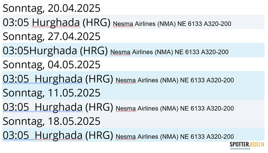 | 2024 Seit dem 23.03.2024 fliegt Nesma Airlines wöchentlich nach Hurghada in Ägypten. Sa NE6304/6305 18:00-19:00 A320  www.flightradar24.com/data/flights/ne6304 |