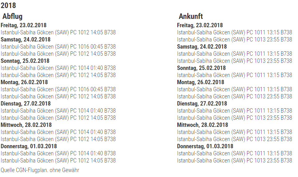 | 2017: B737 SAW tägl. 01:10-01:55 B737 ESB Di 04:20-05:00 B737 SAW tägl. 14:10-14:50 |