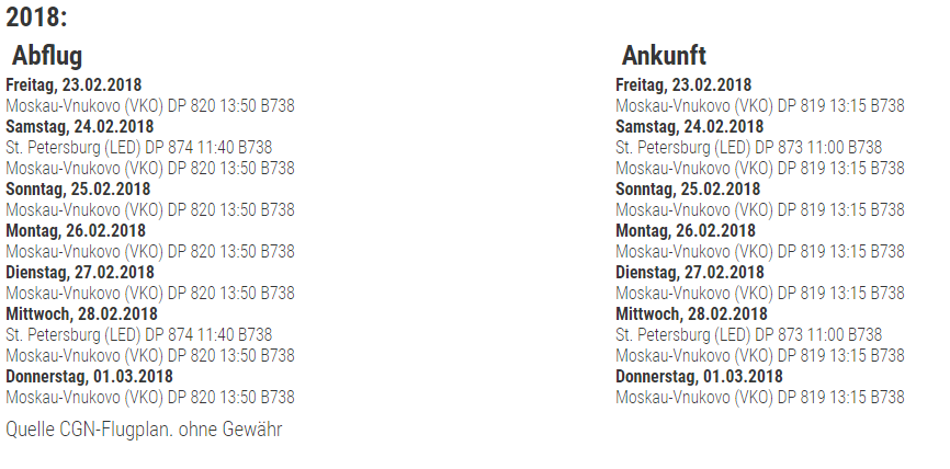 | Seit März 2022 dürfen alle Airlines aus Russland den EU-Luftraum NICHT mehr anfliegen. Die Airline hat Flüge ab Köln Bonn nach Moskau VKO  ab dem 15.02.2016  aufgenommen.
