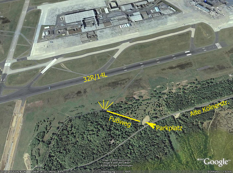 Dieser Spot liegt an der Alten Kölnerstr./ L84, in Köln auch bekannt als "Panzerstraße". Von hier lassen sich Fotos von Fliegern machen die über 13L/31R (ex 14L/32R) starten oder landen. Durch oder über dem Zaun und auch durch ein Notfalltor des Flughafen sind Fotos in Richtung des Terminal 1 von CGN möglich. Eine Leiter mit mind. 5 Stufen ermöglicht über den Zaun zu Fotografieren ohne das man zu nah an diesem steht.
